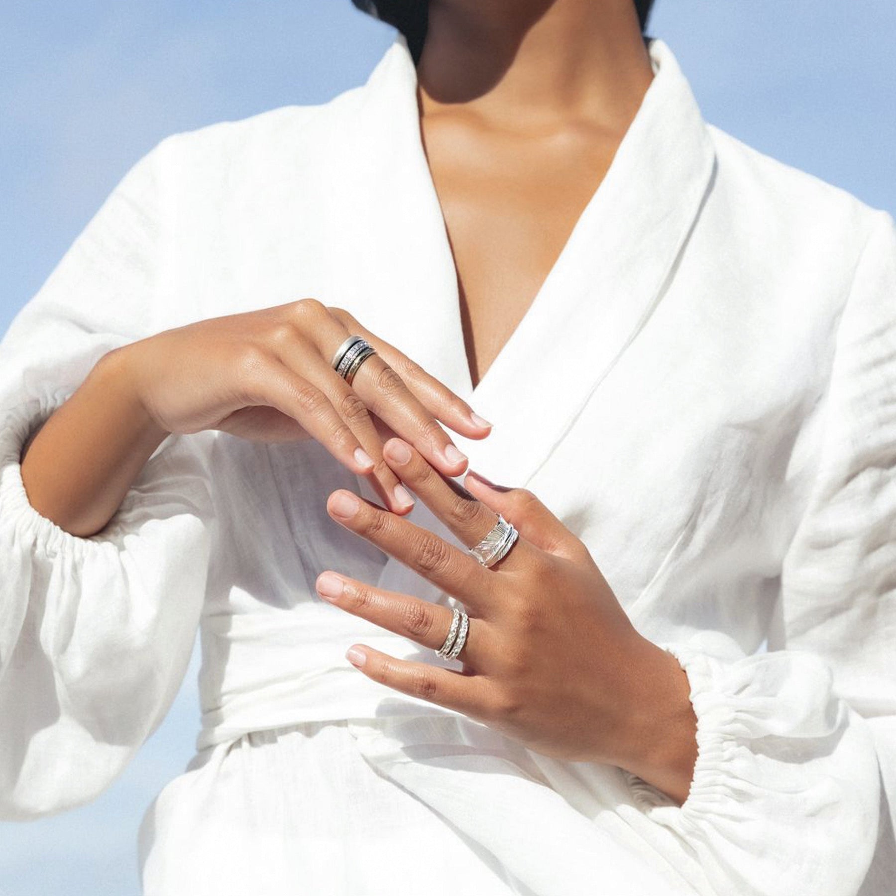 Sterling Silver Meditation Ring with a beautiful intricate oval and marquise spinning band with semi-precious Blue Topaz Gemstones & Clear CZ. Stack them any way you like, these versatile fun Meditation Rings can be worn in many different ways! Includes complimentary MeditationRings Tin & Travel Pouch.